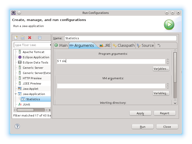 Simulating command line arguments in Eclipse requires a run time